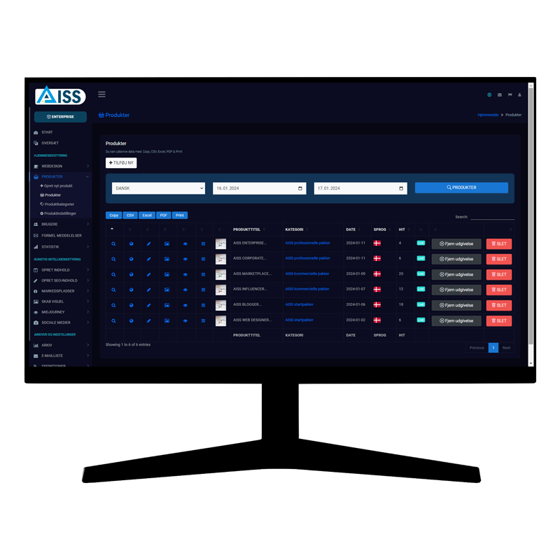 AISS ENTERPRISE er et avanceret indholdsstyring og indholdsskabelsessystem, der inkluderer alle funktionerne i al anden AISS-software, så du kan udgive og administrere på 15 sprog. Det er også den eneste AISS-pakke, hvor du kan printe tilføjelser efter dine behov ved at kontakte vores softwareteam.