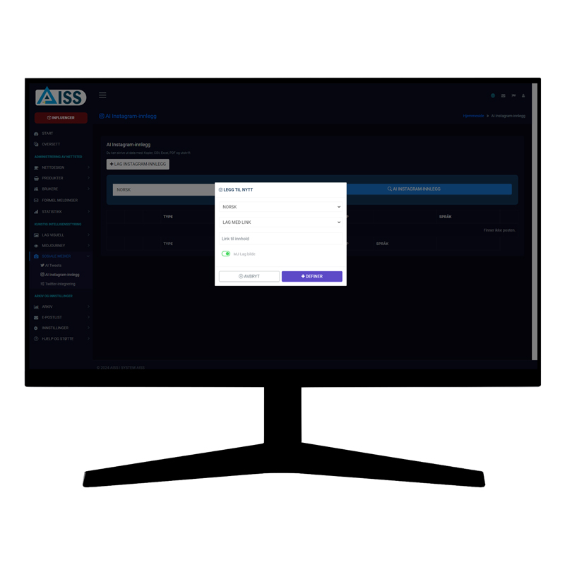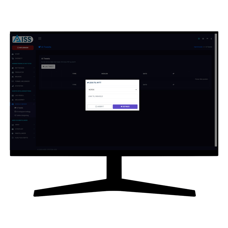 AISS lager automatisk Twitter- (X) og Instagram-innlegg og kreative bilder av høy kvalitet ved hjelp av kunstig intelligens med AISS INFLUENCER, spesielt utviklet for brukere som gjennomfører prosjekter på sosiale medier, jobber salgsrettet og produserer innhold.