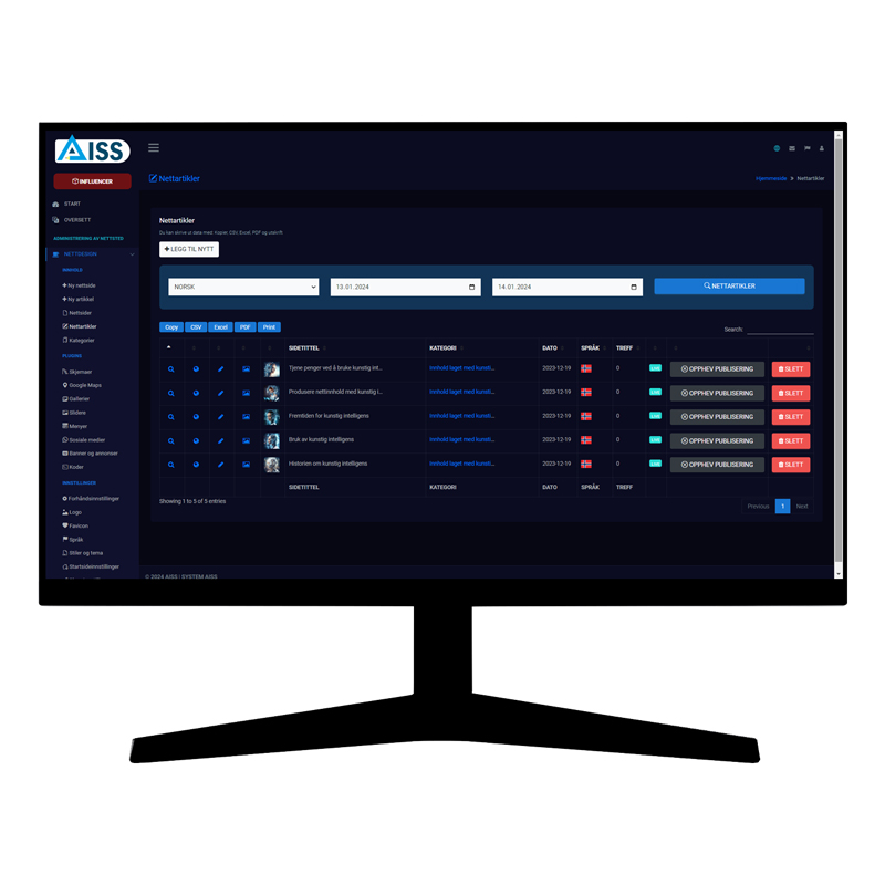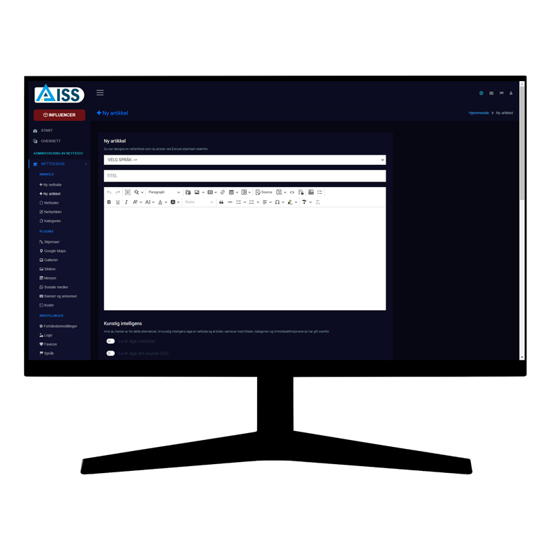 Det har aldri vært enklere å opprette, designe, administrere og publisere en nettside. Opprett og administrer nettstedet ditt på få minutter med kunstig intelligens fra AISS WEB DESIGNER. Dessuten med 15 språkalternativer samtidig.