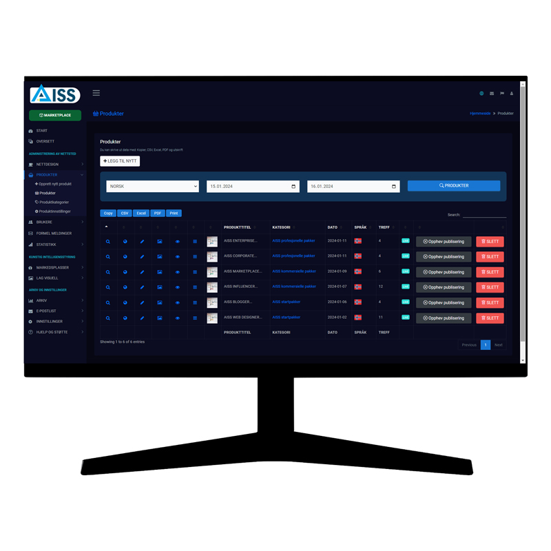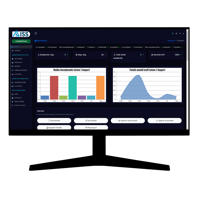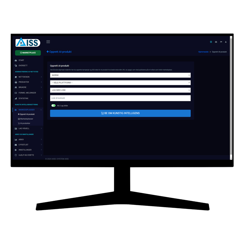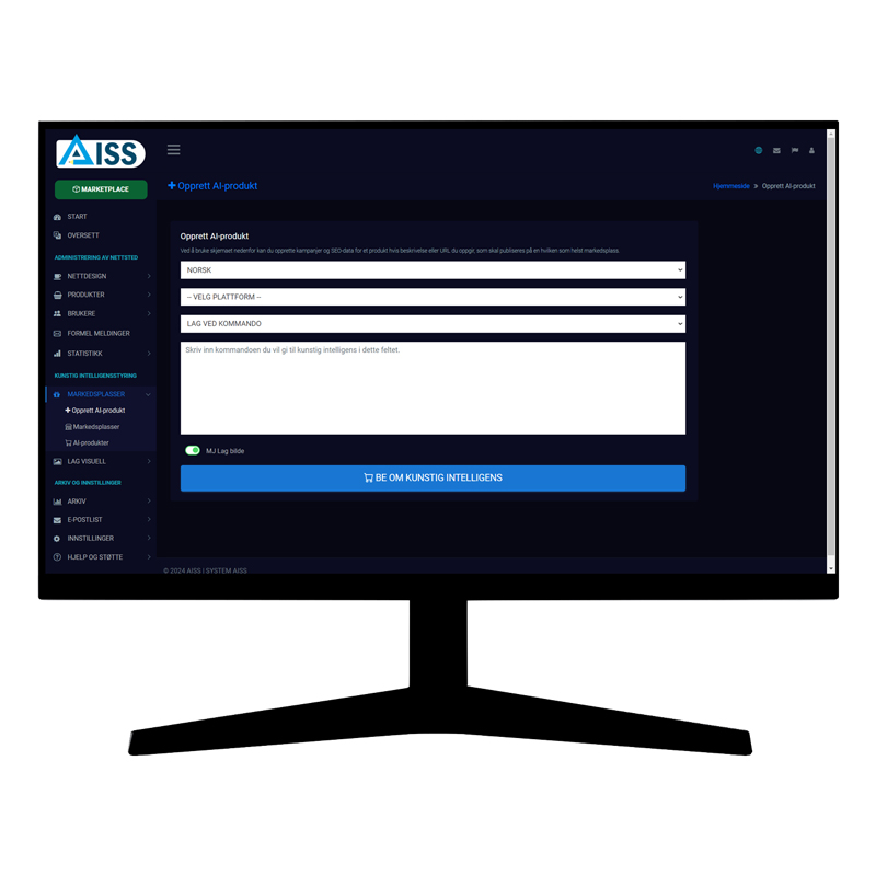 AISS lar deg lage produkter, produktbilder, produktbeskrivelser og produktdetaljer som skal vises på hvilken som helst markedsplass du vil, med AISS MARKETPLACE kunstig intelligens utviklet spesielt for brukere som selger produkter gjennom markedsplasser.