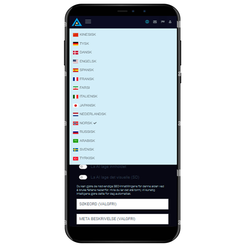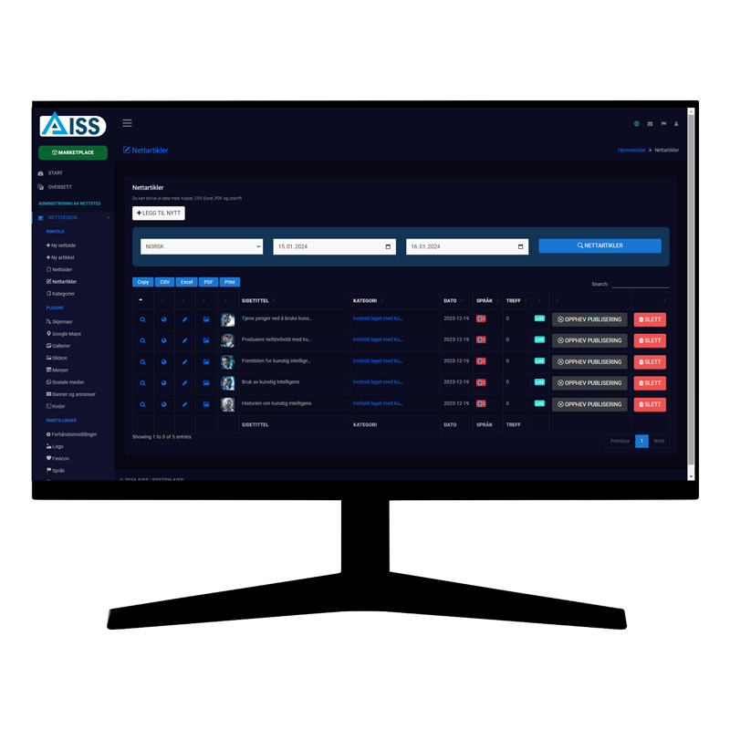 Det har aldri vært enklere å opprette, designe, administrere og publisere en nettside. Opprett og administrer nettstedet ditt på få minutter med kunstig intelligens fra AISS WEB DESIGNER. Dessuten med 15 språkalternativer samtidig.