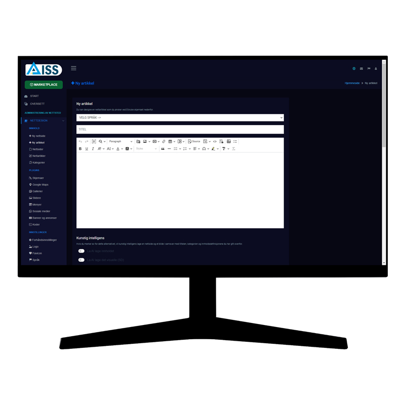 Du kan lage bilder med AISS kunstig intelligens for produktene du skal lage med AISS MARKETPLACE.