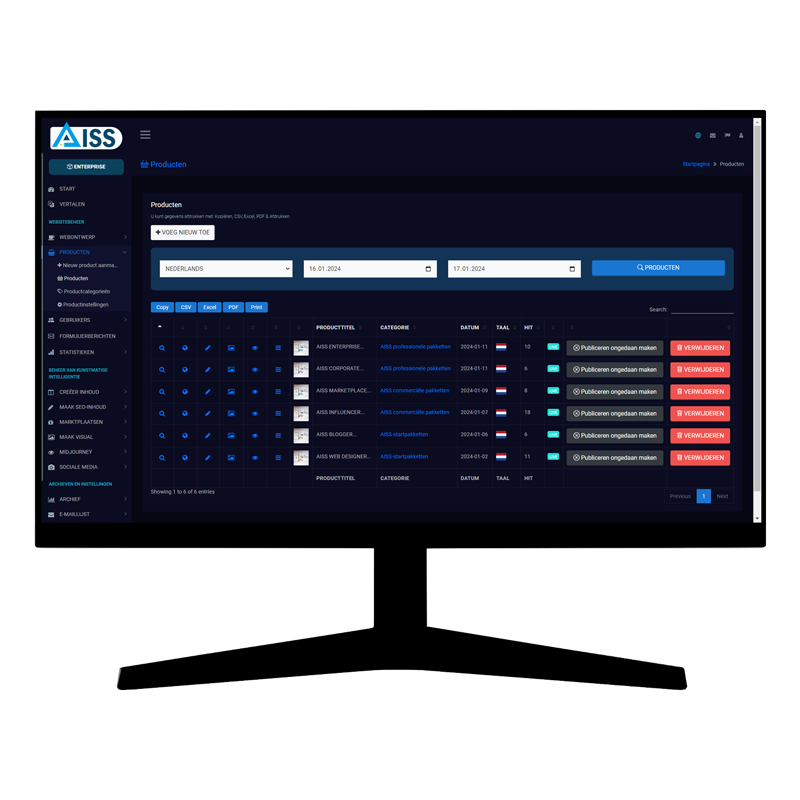 De productbeschrijvingen, trefwoorden en productkenmerken van de producten die u gaat maken met AISS ENTERPRISE kunstmatige intelligentie. lijst wordt automatisch gemaakt.