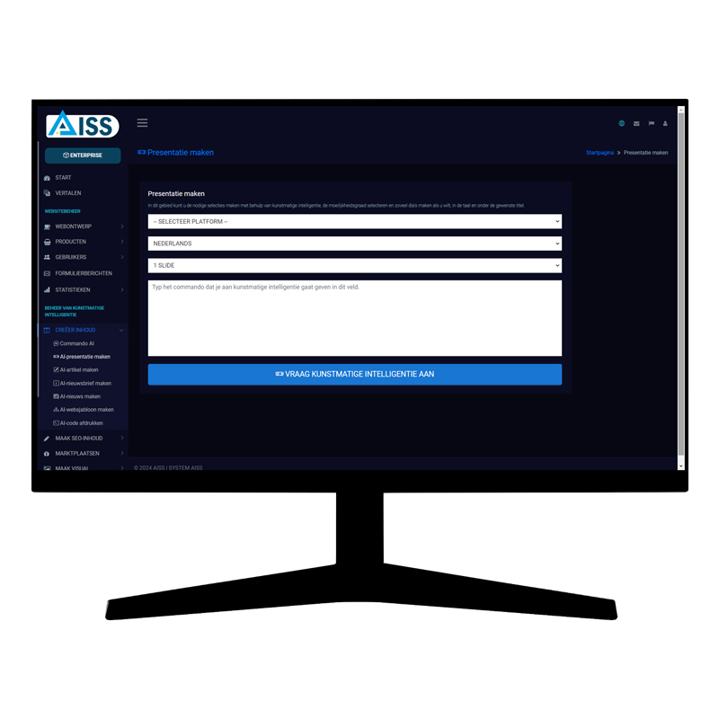 Gebruik AISS ENTERPRISE kunstmatige intelligentie in uw presentaties. U kunt dia-inhoud maken zoals.
