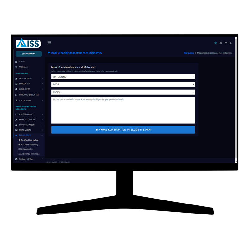 AISS ENTERPRISE kunstmatige intelligentie, met behulp van de wizard voor het maken van visuele beelden, of op basis van het recept kun je hoogwaardige beelden maken met de MIDJOURNEY-infrastructuur en sociale media. U kunt op uw platforms verschijnen met uw originele creatieve beelden.