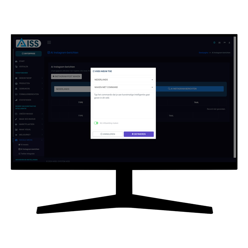 AISS ENTERPRISE kunstmatige intelligentie. Je kunt Instagram-posts maken met hashtags en afbeeldingen gerelateerd aan.